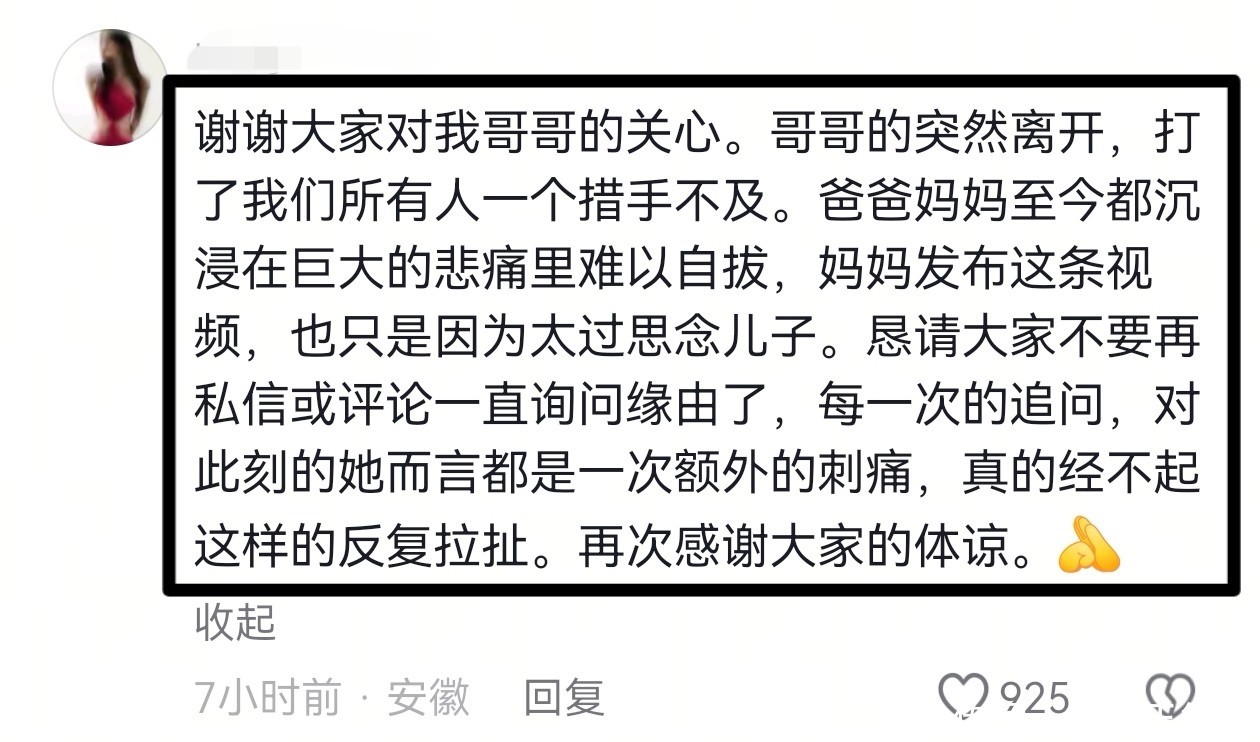 妹妹对大家的关心表示感谢,但哥哥的突然离开让大家很懵,父母至今还处于巨大的悲伤中无法自拔,妈妈发文只是因为思念儿子,希望大家不要在追问,因为每一次追问都会让妈妈难受。